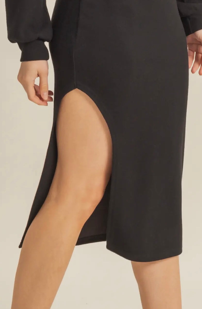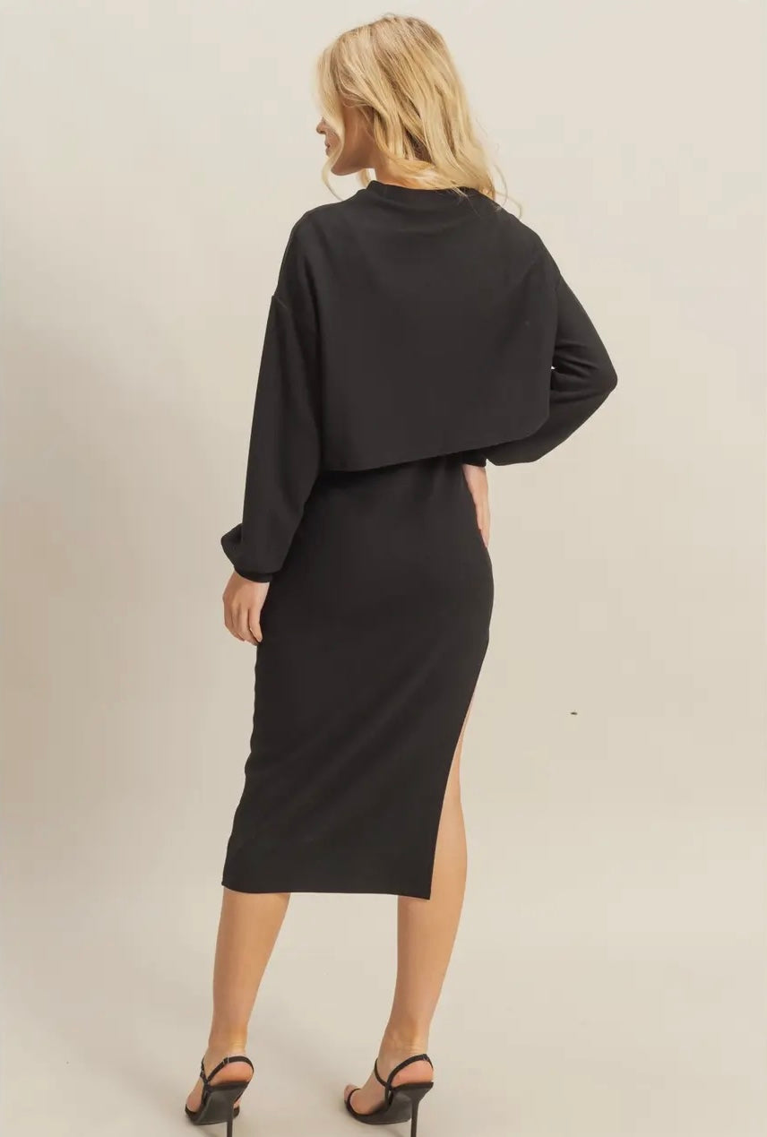 Own the room without saying a word. The Blackout Babe Set pairs a cropped sweatshirt with a curve hugging midi skirt and a bold thigh high slit- serving cozy comfort with main character confidence. Dress it up with heels or keep it street chic with kicks... either way, the spotlight follows you.