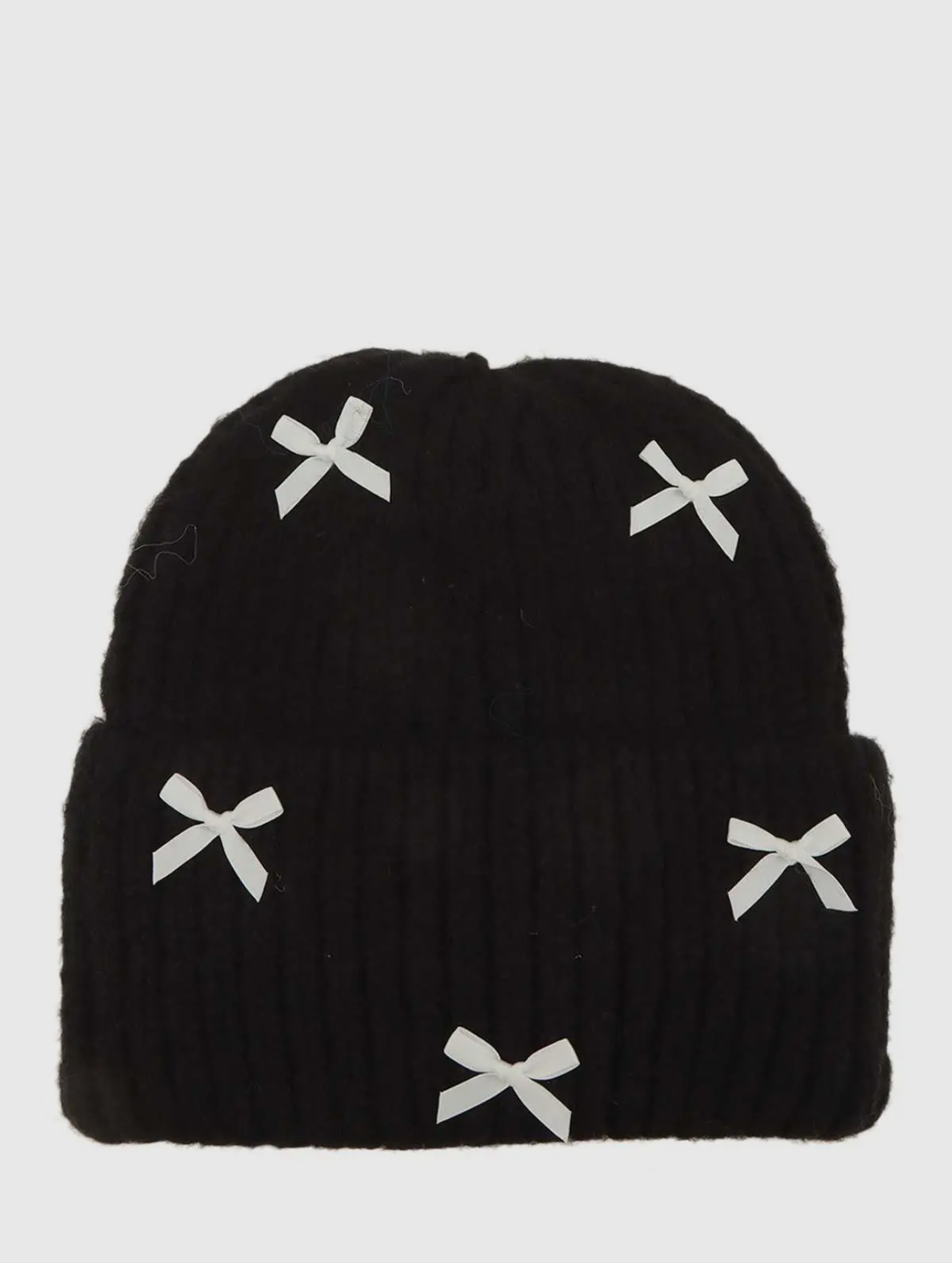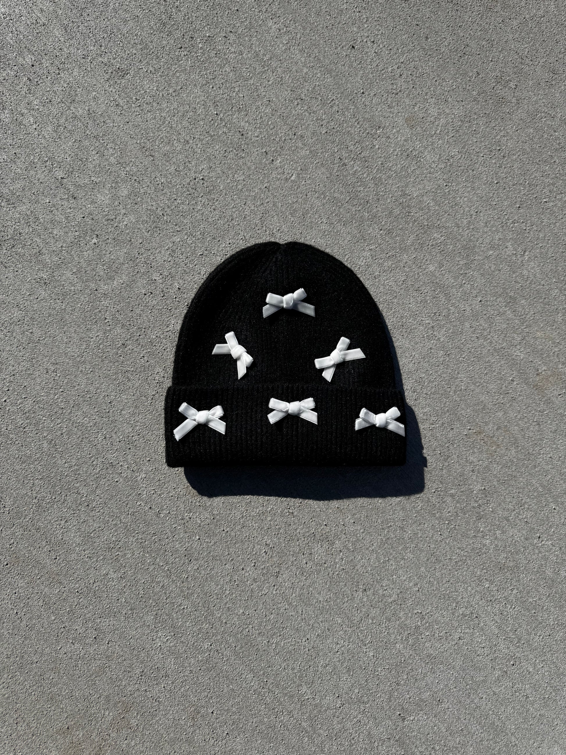 She’s soft. She’s dangerous. She’s the girl who turns heads without even trying. Femme Fatale Knit blends dark street energy with angel-sweet details — a sleek black beanie adorned in bold white bows for that perfect mix of innocent and intimidating.